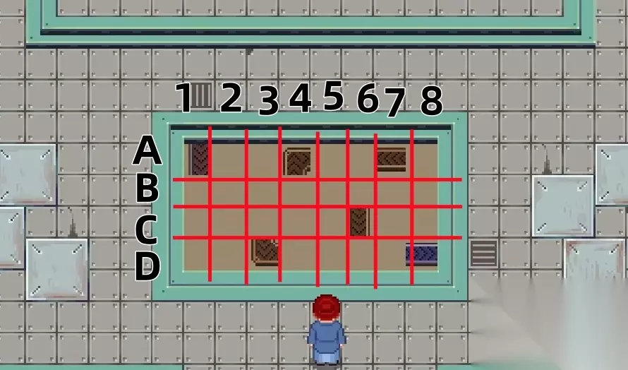 天机秘境传送带解谜位于坐标(64,37),各位来到这后与天机秘境交互,就能进入到秘境中,往前走两步就能看到本次所需要解开的传送带谜题,它以一个4*8的沙盘形式呈现。解谜规则很简单,各位只需利用传送带将谜题里的各部件连起来,并确保入口和出口保持连通即可。为了方便各位参照,本次就横排从上至下标注为A至D,竖排从左至右标准为1至8,如图中所展示的那样。