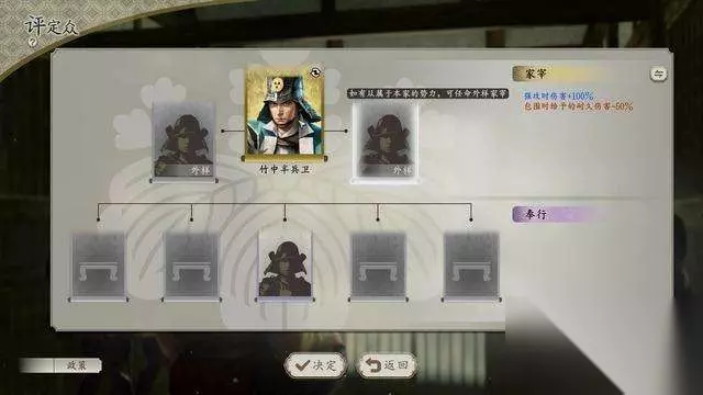 1.家宰与奉行 本作新增了“评定众”系统,可以将身份为“家老”以上的武将任命为“家宰”,“部将”以上的则能任命为“奉行”。 需要注意的是,一旦将任命武将卸任后,直至大名(君主)更替为止,都无法再次任命。