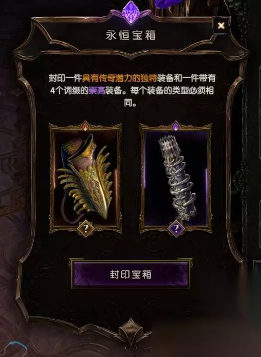 击杀茱菈同学后,来到下一个场景,按D穿越到神圣纪元,点击中间的建筑打开永恒宝箱。其具体放入装备的需求,如上图所示。 传奇潜能值为1~4,代表其在封印后可获得的词缀数量。获得的词缀,均为目标崇高装备的对应“潜能值”条数的“随机”词缀(不会100%命中崇高词缀)。 其中“崇高装备”为具有一条T6~7词缀的装备,默认为紫色。只能通过刷图掉落,普通稀有装备无法锻造至T6~7。