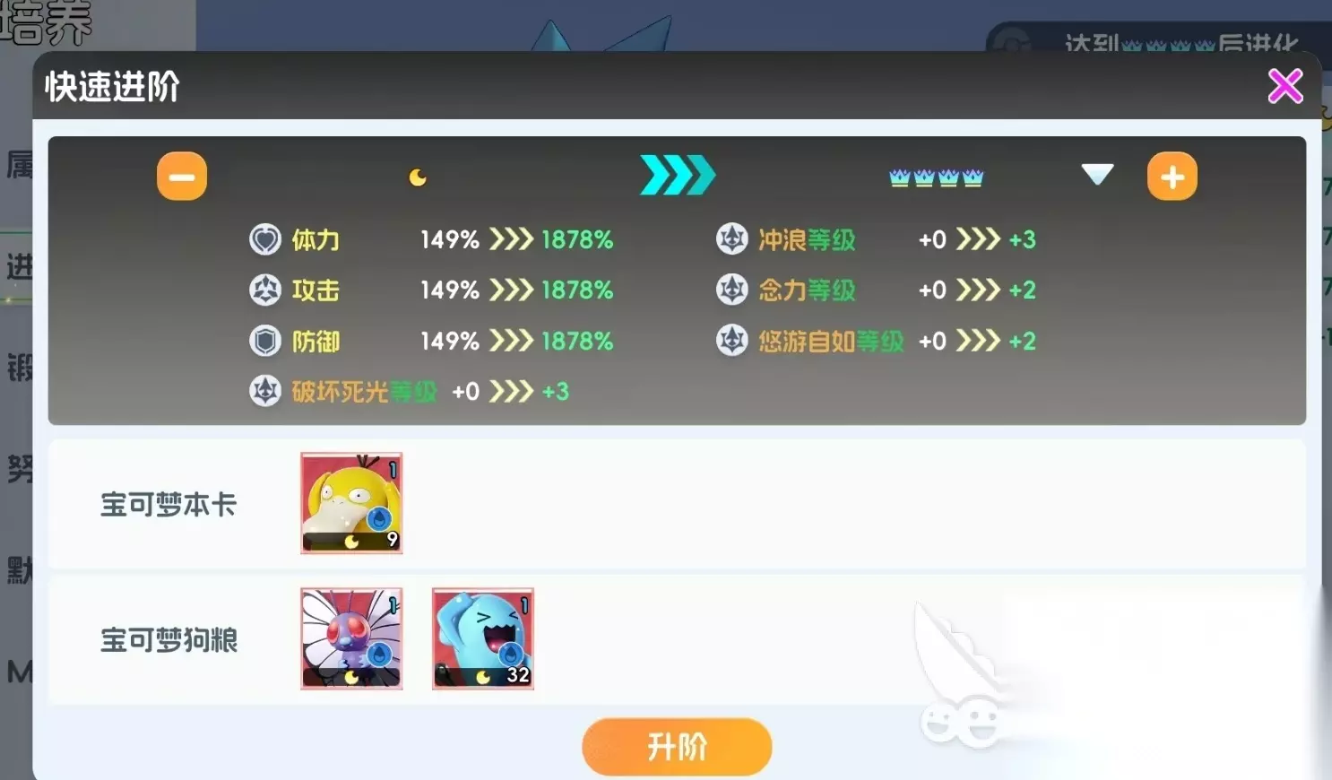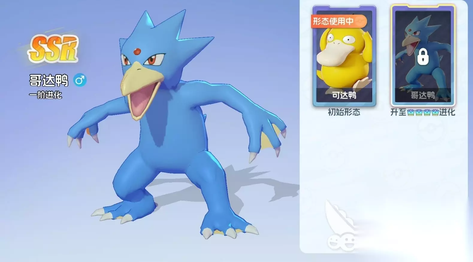 以上是宠物集结哥达鸭怎么进化的办法。总的来说哥达鸭的进化成本并不高,而且它是初始品级为SSR级的宝可梦,抽卡也较好获得,但在进化后它的强度会上升很多,在没有高星SP宝可梦时可作为输出核心,也可配合SP级攻击型宝可梦一起上阵。
