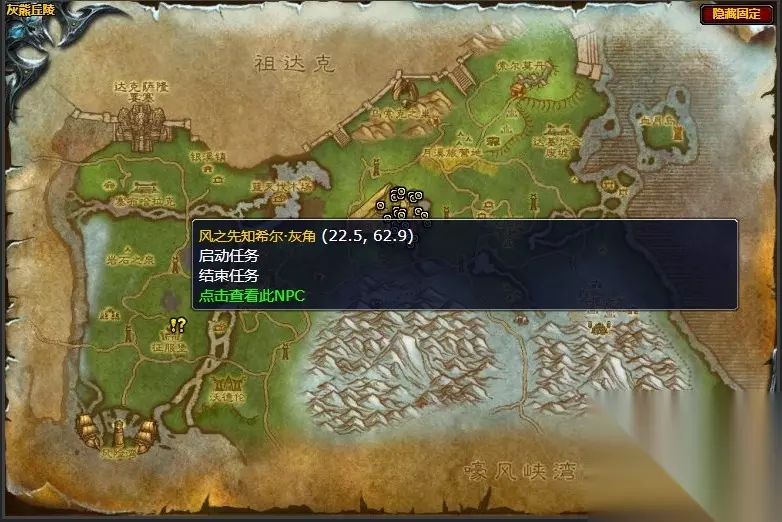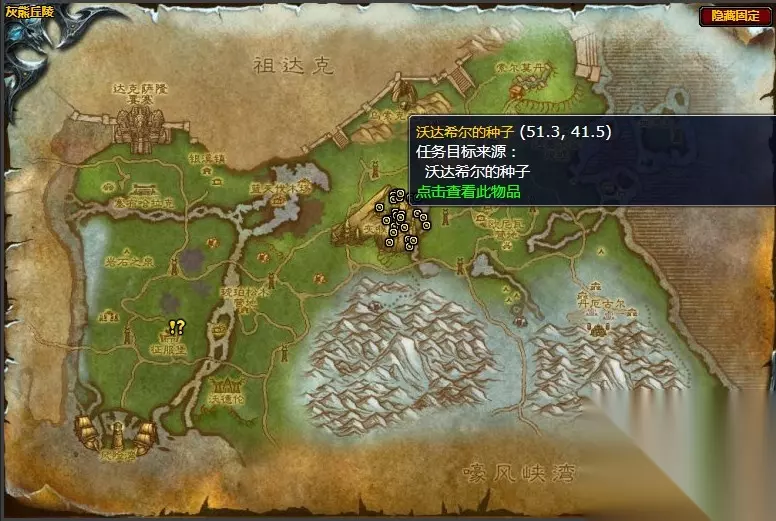 在《魔兽怀旧服》游戏中,沃达希尔的种子任务,需要玩家转至灰喉堡取回8颗沃达希尔的种子交给风之先知希尔·灰角,从而获得一件绿色装备、金币银币及经验奖励。 《魔兽怀旧服》灰熊丘陵沃达希尔的种子任务攻略 接取任务NPC:风之先知希尔·灰角 交任务NPC:风之先知希尔·灰角 风之先知希尔·灰角位置图 坐标:(22.5,62.9)