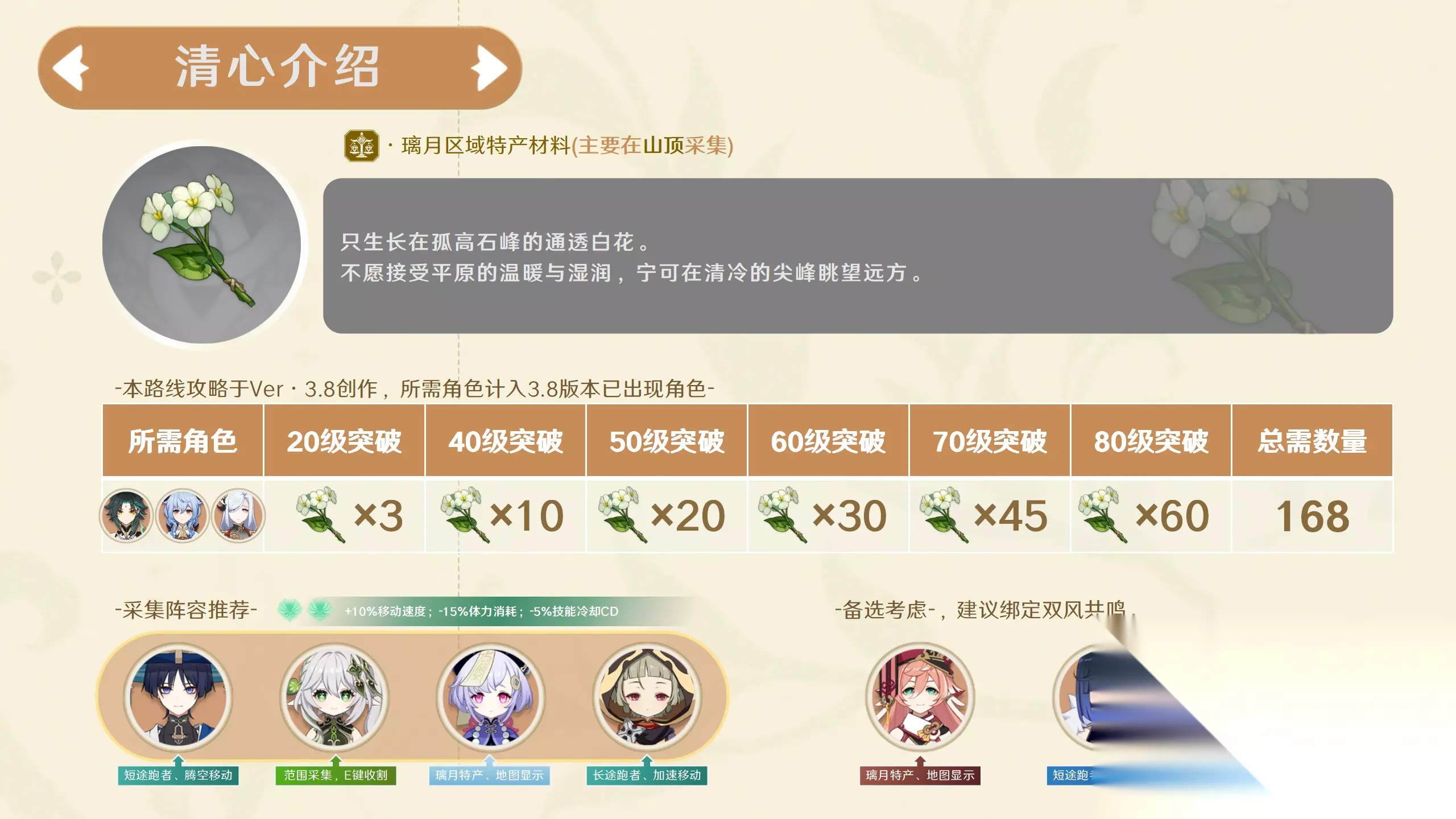 清心,璃月区域特产,主要用于角色等级突破,目前是魈、甘雨和申鹤的角色等级突破的刚需材料。 也是部分食物的刚需材料: 1、「琼玉果汤」,对应白术的特殊料理「清热降火汤」; 2、「天枢肉」。 PS:所有的特产类材料,每个世界都是现实时间48小时刷新制。 为了更好的寻找位置,每个路线图中都插入了实机拍照一览图,若需其他优化非常感谢给出建议!