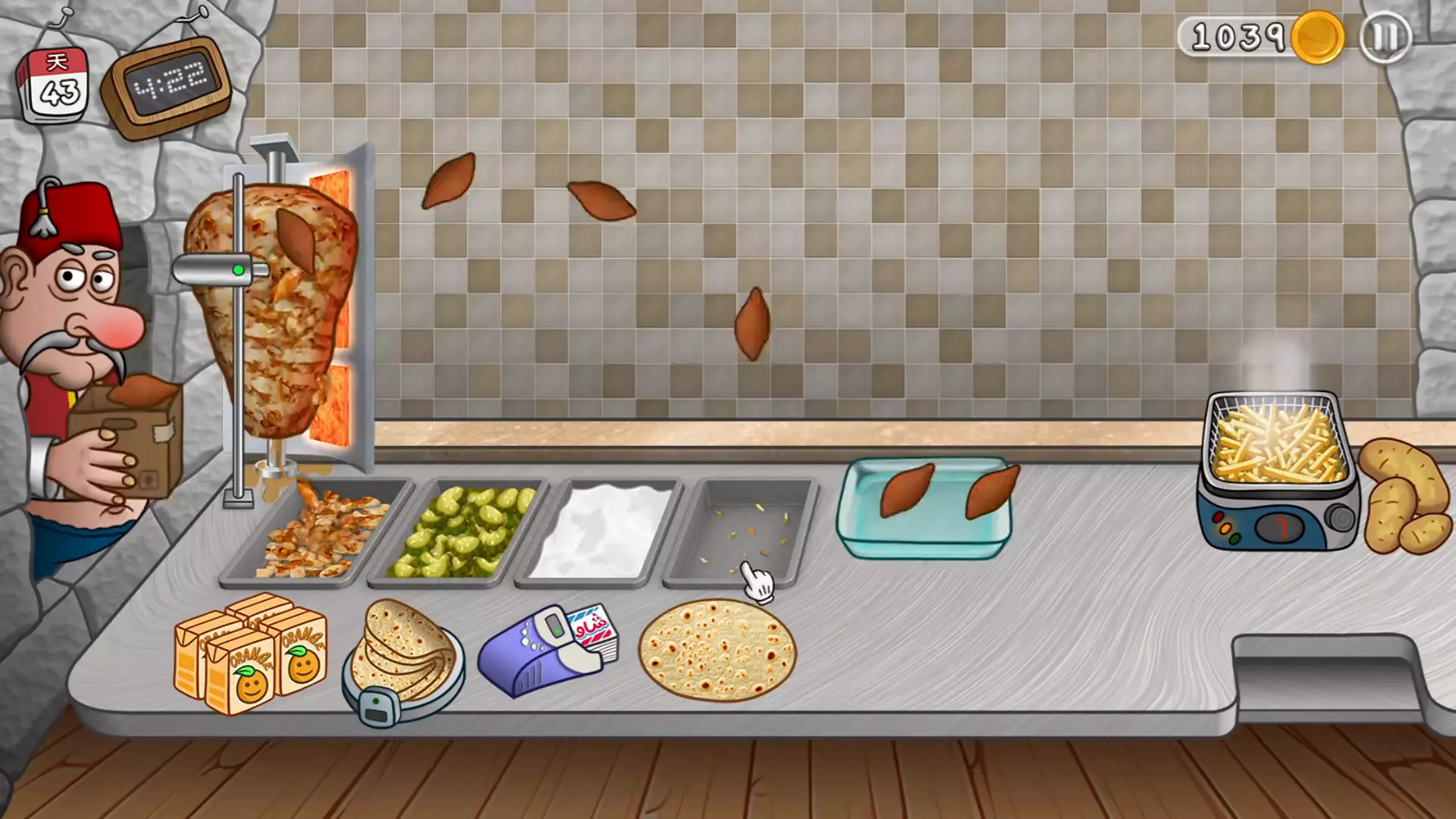 这是《沙威玛传奇》游戏第63天的怀旧向内容,展示了游戏里制作沙威玛餐品、接待不同顾客的经营过程,玩家需根据顾客需求搭配餐品,完成经营任务。
