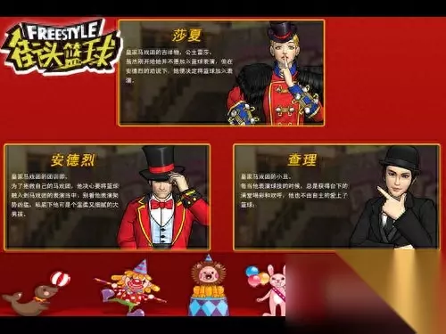 图1:皇家马戏团 在《街头篮球》夏日嘉年华版本中,玩家登陆游戏即可领取皇家马戏团的三个明星角色,他们不仅外观讨喜,还是全能型选手,前锋、中锋、后卫三种职业都可以选择,一个角色技能满足所有需求。