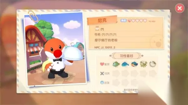 二、尼克喜爱: 喜爱:白菜、石榴炸冰虾、鲶鱼、河豚 厌烦:百合花 三、资料获取地址: 白菜:家乡栽培 石榴炸冰虾:石榴x2、冰川虾x2、冰川红虾x1、鳌虾x1; 鲶鱼:家乡池塘、雪山鱼池 河豚:阳光草场奥秘湖。