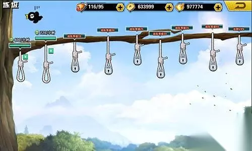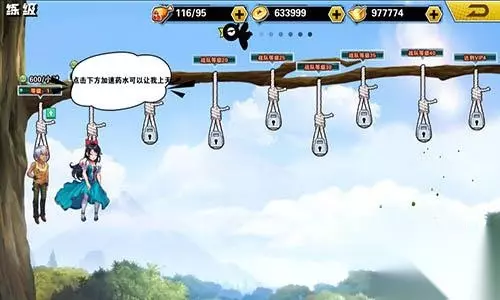 点击绳子,可以选择需要练级的英雄上吊练级,上方可以看到升级进度条和等级以及时间,点绿色小箭头还可以升级栏位,升级栏位需要消耗元宝,英雄每小时获得经验提高。