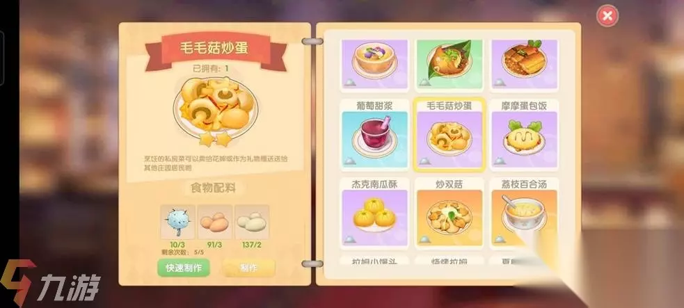 食材获取: 毛毛菇:浆果丛林、阳光牧场、开心农场都有分布,而且毛毛菇只在下雨天刷新。 鸡蛋:14级解锁家禽小屋,在家禽小屋中饲养小鸡来获得鸡蛋; 鸭蛋:在牧场商店中购买鸭子,饲养来获得鸭蛋。
