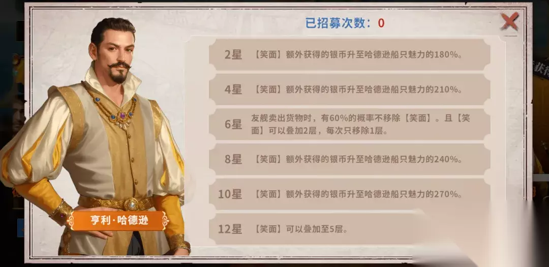 船长:亨利·哈德逊 品质:橙色 获取方式:酒馆招募 技能:船只卖出货物时,使每艘友舰各有30%几率获得【笑面】,下次卖出货物时额外获得银币,数量为哈德逊船只魅力的150%,而后移除状态。 天赋加成:百分比魅力 升星技能: