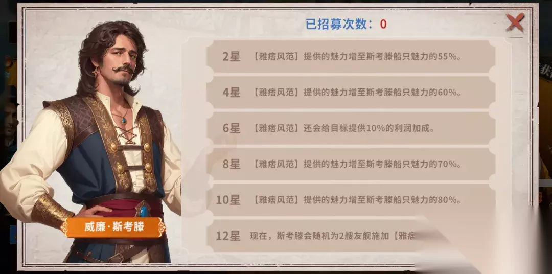 贸易需求越来越大?来看看新的贸易船长,您想好怎么搭配了吗~ 船长:威廉·斯考滕 品质:橙色 获取方式:酒馆招募 技能:船只卖出货物时,随机给1艘友舰施加【雅痞风范】,获得斯考滕船只50%的魅力(上限为该友舰自身魅力的100%),持续至下次卖出货物之后。 天赋加成:贸易暴击率 升星技能: