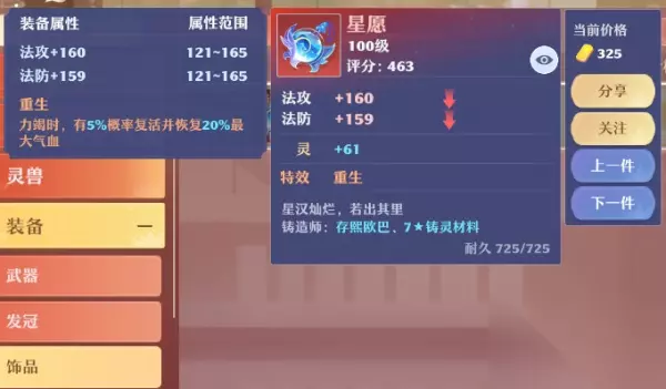 至于特效,兵器“元素”,发冠“猛击”,饰品“重生”,上衣“亲和”,下装“灵慧”,鞋子“疾风”,视为最佳。生长、祝愿、加持、体魄这些都是不错的挑选。