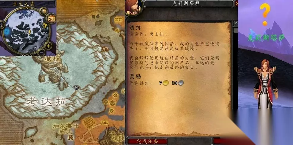 wlk诱饵任务有两个:一个发生在北风苔原,克莉斯塔萨要你在考达拉一带收集10块晶化法力碎片,如果你把奥术牢笼弄丢了,可以去找永生之盾的莱洛拉斯。另一个发生在龙骨荒野,取得“双钳巨蟹”的肉,把它交给莫亚基港口的图尔凯。 一、任务相关信息