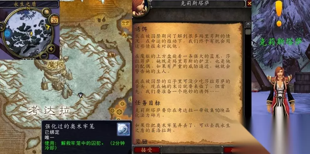 三、详细任务流程 1、北风苔原: 任务开始:在北风苔原考达拉,使用【强化过的奥术牢笼】召唤NPC克莉斯塔萨领取任务,任务目标“克莉斯塔萨要你在考达拉一带收集10块晶化法力碎片”,如果玩家把奥术牢笼弄丢了,可以去找永生之盾的莱洛拉斯。