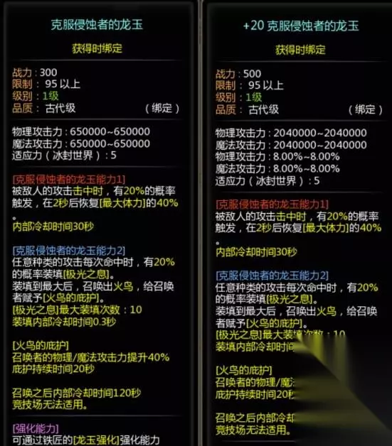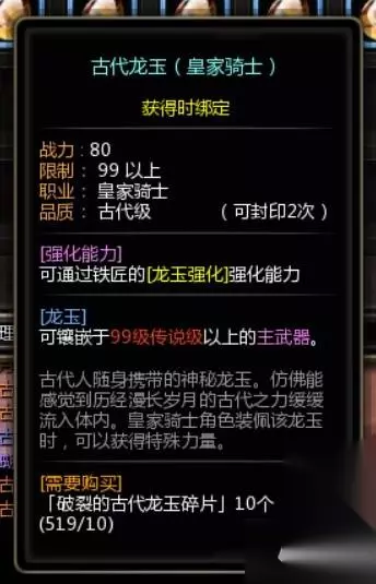 古代级龙玉、可封印4次 可在铁匠处消耗【红莲/赤月/新绿之核】与【精致的红莲/赤月/新绿之核】进行强化,最高强化至+15 红莲/赤月/新绿龙玉可强化对应技能,强化越高,对应技能的加成越高,每5级可提供额外的对应技能的冷却缩减效果 红莲龙玉、赤月龙玉、新绿龙玉只能嵌入主武器 获取方法:消灭落日回廊首领,在龙之秘境6层以上的关卡中消灭小概率出现的安息处型侵略者获得龙玉碎片,并在铁匠处制作。 最简单的方式还是直接买,便宜省事,交易所价格在几十到几百金币的样子,向导任务也有送,反正不建议去刷出来。 古代龙玉 品质为古代级,可以封印2次、最高强化至15。 穿戴后可以强化【古代之力】技能。 获取方式:在梅拉镇商人莎莉娜使用破碎的古代龙玉碎片兑换。 强化材料获取:通关无限方舟获得制作/强化材料。 强化方式:铁匠铺→铁匠铺交易→龙玉强化,+1~+10时必定成功,+11~+15概率成功。