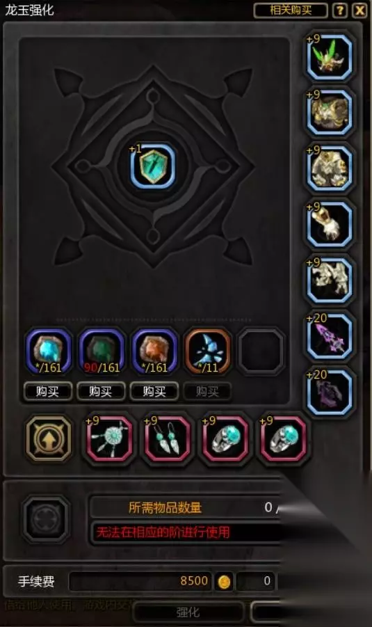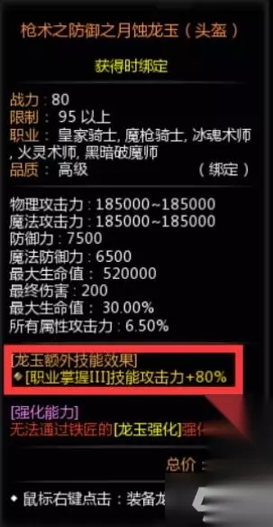 强化 除了升级品质,还能够通过龙玉强化加强面板属性,我们找到铁匠后点击铁匠铺交易→龙玉强化便可以开始强化龙玉,消耗的高级月蚀碎片和月蚀痕迹。