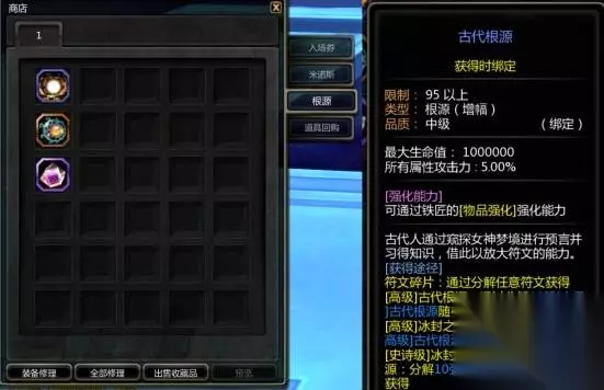 根源 根源需要在银龙的结界里找到黑暗神官格里西亚,她商店的根源页里可以购买到,这几个根源之间的关系就是强化10之后可以搞到下一级的0强版本,品质最低的古代根源需要30个符文碎片(分解任意符文获得)+10000金币就可以买到了,然后再铁匠铺装备强化加到10分解能搞到更高品质的根源。
