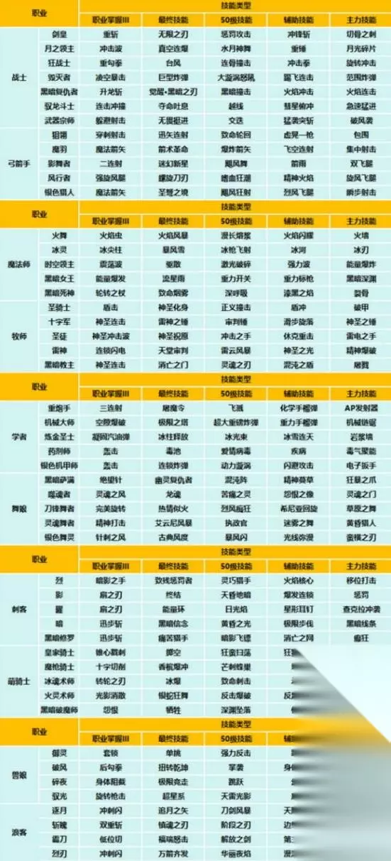 不同职业各词条对应技能如下: