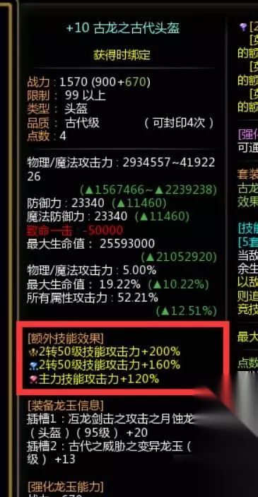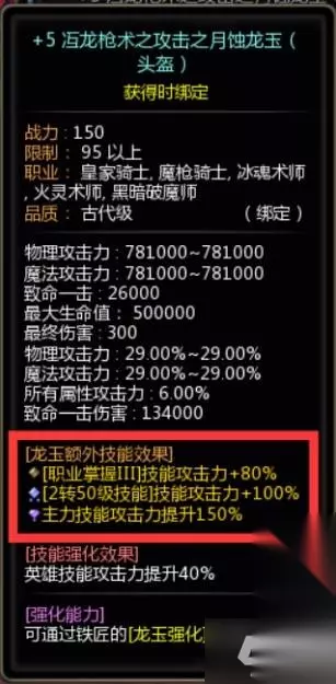词条 龙玉在升级为中级品质时会获得一个额外技能效果词条,升级到史诗级解锁第二个,传说级解锁第三个到达上限。不同职业会因为强势技能不同所以词条选择上也有所区别,可以去查看排名靠前的玩家他们是如何选择的。 通常来说二转50技能、新绿/赤月/红莲是收益最高的词条。