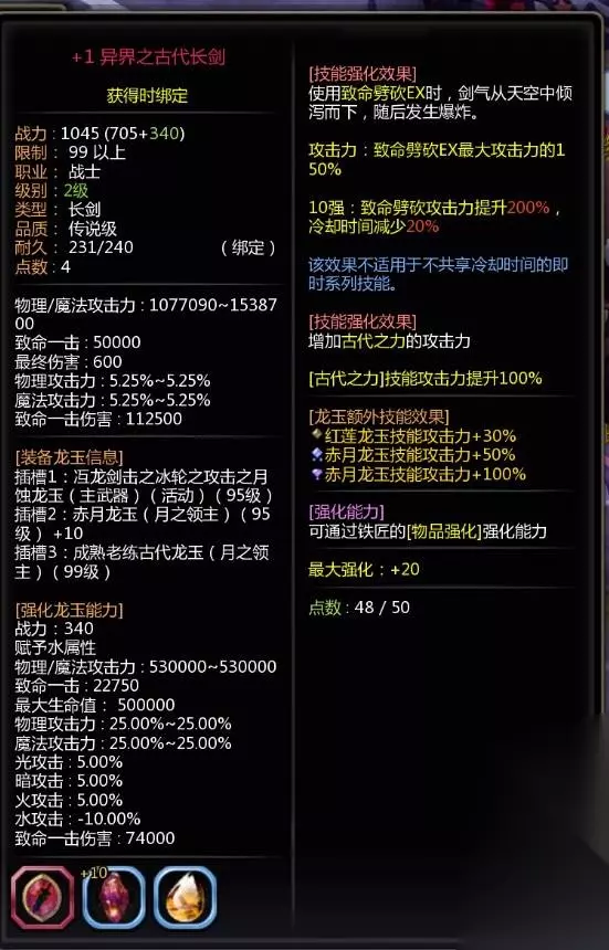 古龙武器性能会好很多,可以商城购买古龙武器袋子获得(或者自己去骨龙副本刷掉落),目前价格几十万的样子,不过在后期阶段这几十万还是值得花的,提升幅度不小。