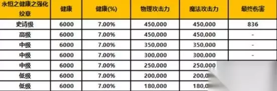 强化纹章 强化纹章的孔位目前主流使用永恒系列纹章,前期系统会赠送一套盛放系列先用着。 强化纹章产出主要依靠次元缝隙,只会提供最基础的面板属性,价格上比护符高得多,但是差距又没有护符的盛放与永恒系列差距大,可以先用送的盛放纹章,护符搞的差不多了,再购买缺少的永恒纹章替换盛放纹章即可。 永恒纹章分为低级、中级、高级、史诗级,根据攻击力、最终伤害不同分为7个不同档位。 其中纹章基础属性固定,以健康纹章为例,具体属性和分级如下: