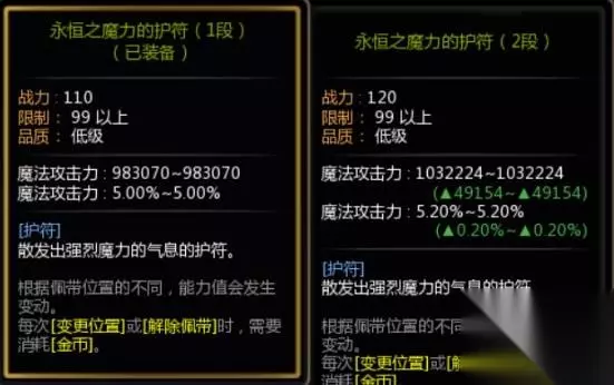 主要获取途径: 侵蚀迷宫掉落侵蚀碎片,宫女迟月英兑换,铁匠强化和制作二阶段进化装置。 护符 目前主流的护符是永恒+黑龙系列护符。 永恒护符 永恒护符的升级成本过高,而低级获取容易,1段的小几百金币一个直接交易所买吧,平民玩家用个1段就可以了,2段价格翻很多倍,属性差距只有下面这点。