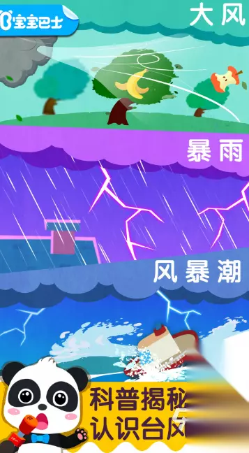 游戏场景真实还原生活场景,包含塑料制品、厨余废品、有害废物等六大类常见垃圾,每种垃圾都配有专属的回收容器。当小朋友准确完成分类投放后,系统会即时给予"绿色勋章"奖励,累积一定数量后即可开启进阶关卡,同时还能获得动态电子宠物和环保小卫士称号等激励性奖励,在游戏中潜移默化培养孩子的环保意识和社会责任感。 高速下载 普通下载 优先233乐园APP下载 2、《宝宝台风天气》