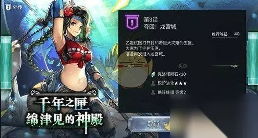 章节攻略流程 奇拉海滩 1、在地图左方接受任务。 龙宫城 1、在二之丸·梅地图上方与鱼人士兵对话。 2、进入三之丸·梅地图左下方的房间。 3、点击房间中的宝箱,传送到龙宫城·过去。 龙宫城·过去 1、从三之丸·梅地图左上方进入下一层。 2、在三之丸·竹地图中央附近调查可疑的石头。 3、进入三之丸·竹地图左上方的房间,与男性鱼人对话选择“是”。 4、在三之丸·竹地图左边调查地板的裂痕。 5、进入三之丸·竹地图下方的房间,与木匠对话选择“是”。 6、进入三之丸·竹地图中央附近清除生长的珊瑚。 7、点击三之丸·竹地图中央附近的宝箱,穿过时空裂缝。 龙宫城 1、从三之丸·竹地图右上方进入下一层。 2、在三之丸·松地图西的酒吧内,点击酒桶,穿过时空裂缝。 龙宫城·过去 1、从三之丸·松地图中央附近的看板向下前进。 2、在三之丸·松地图西的酒吧内,点击酒桶,穿过时空裂缝。 龙宫城 1、穿过三之丸·松地图左下方的时空裂缝。 龙宫城·过去 1、从三之丸·松地图上方进入下一层。 2、跳进二之丸地图左上方的鱼塘。 龙宫城 1、在二之丸地图上方的卫兵对话。 2、收集110000个龙宫珍珠。 3、再次与卫兵对话后通过,并与BOSS乙姬战斗。 友情提示:第三话结束后,解锁平行迷宫:龙宫城(非常困难)。 BOSS乙姬介绍