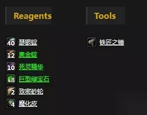 需要素材:瑟银锭x40、奥金锭x15、死灵精华x10、巨型绿宝石x8、致密砂轮x2、魔化皮x4 学习等级:锻造300 学习自:由图纸歼灭者学习,图纸由黑石塔的军需官兹格雷斯掉落,掉率10%。