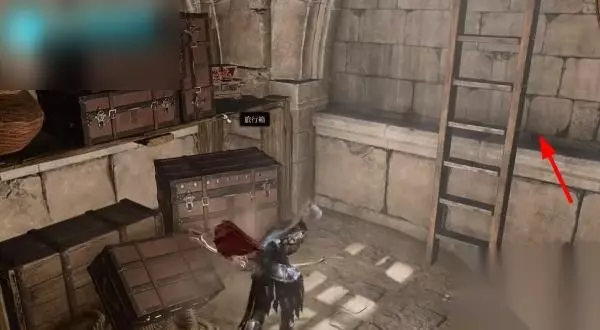 2、找到位于右边前方墙角处的木梯,旁边堆放着一些木箱和木材,玩家需要登上木制梯子,前往二楼房间。
