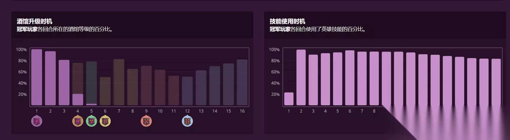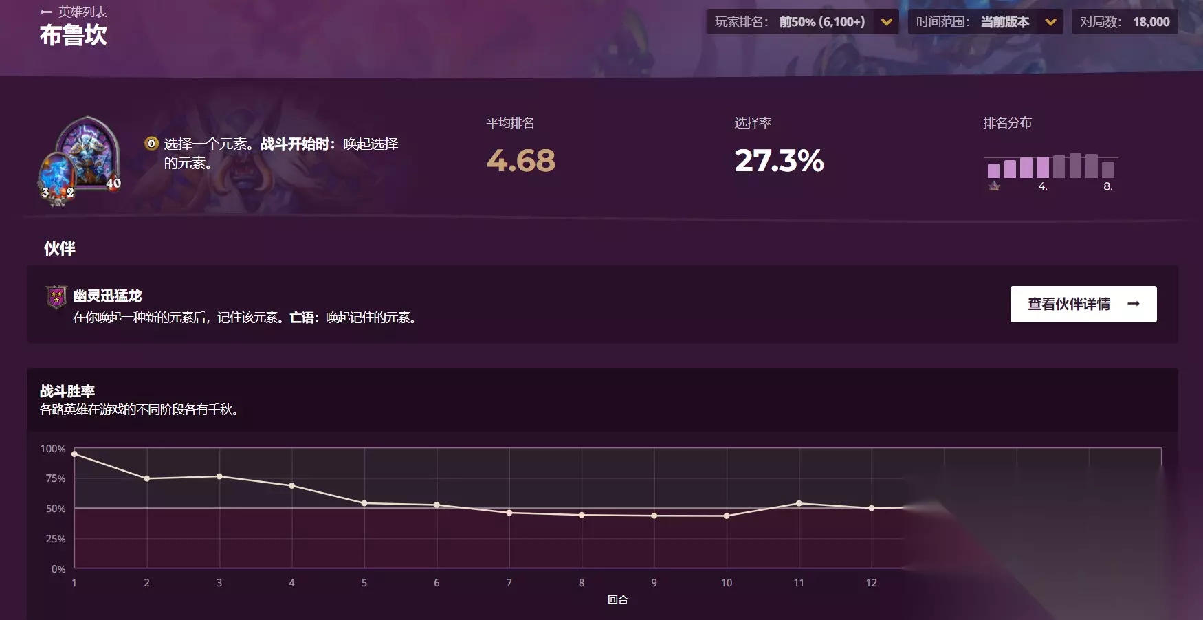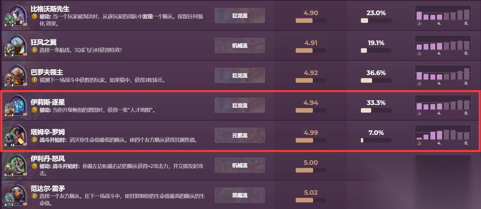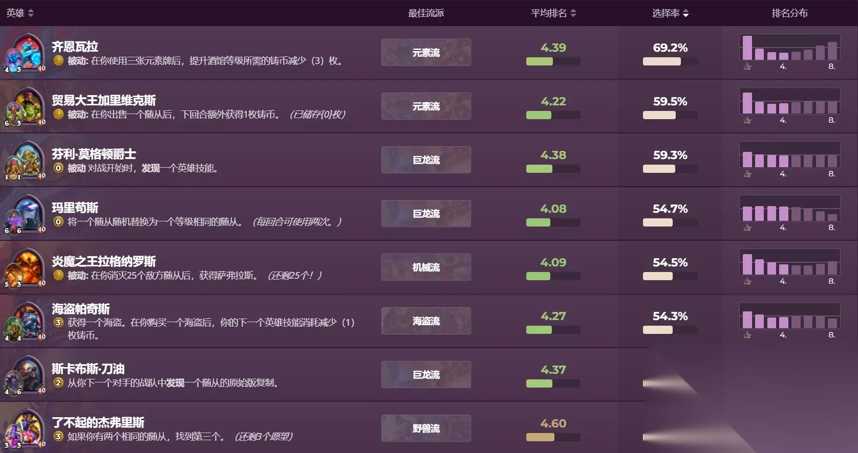 平衡上线后清风玩了很多把伊莉斯·逐星,个人感觉肯定是比之前强的,但确实不适合现在的环境和节奏,比较吃运气,前期伊莉斯的伙伴收益不高,但本身没有成长性,作为三星伙伴经常没办法撑到后期三连就得卖了,为了增加伙伴收益就得速跳本,而在目前苟烂分的环境下,如果跳本没拿到强力牌就很容易暴毙。塔姆辛没怎么玩过,个人感觉前期靠技能场面上确实很强,但是到后期技能和伙伴都很乏力,而且还六打七有劣势,所以在排名分布上越想拿到更高名次越难。 选择率排名