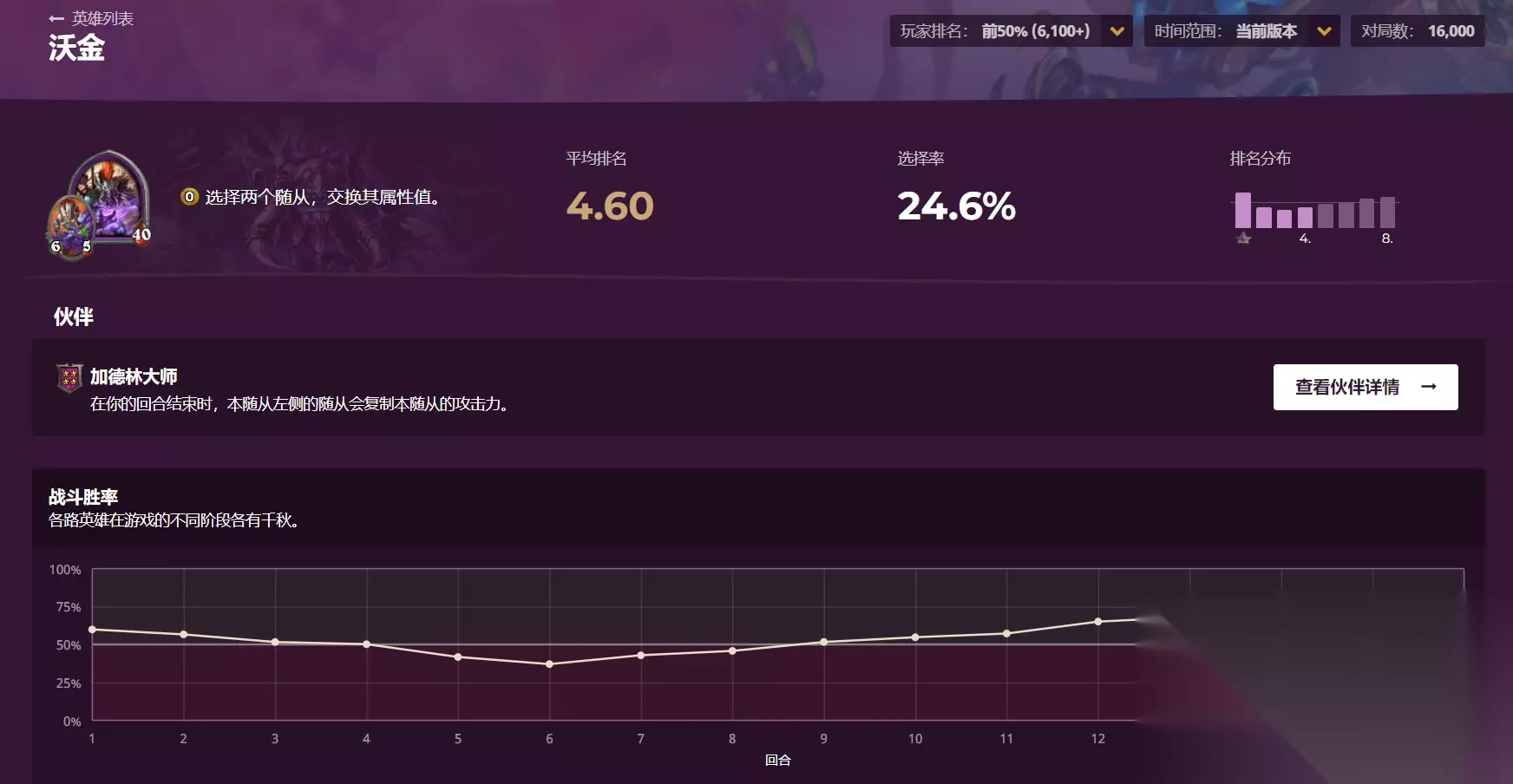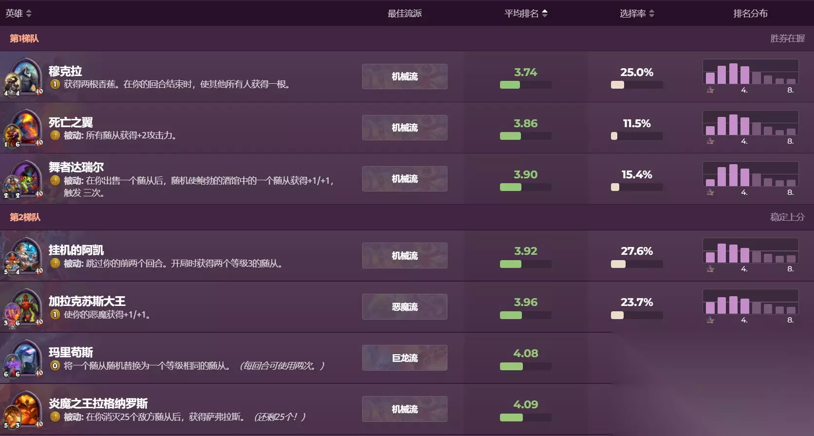 目前平均排名比较靠前的几位,包括加拉克苏斯大王都是苟烂分英雄,主要靠技能或者伙伴苟活进决赛圈,其中比较让人意外的是死亡之翼,当时看到死亡之翼伙伴的时候,大家的感想都是“别惦记你那加攻了”,但数据表明把某项能力拉到极致或许就能发生质变,死亡之翼基本和削弱前的沃金差不多,制造一堆大头娃娃狂战圣盾风怒随从来获取优势,还可以靠机械和野兽来增加攻击的频率。而阿凯则是靠养一些优质的三费随从苟活,像爆裂飓风,偏折,青铜守卫这些圣盾随从都是各种族最好的胚子。