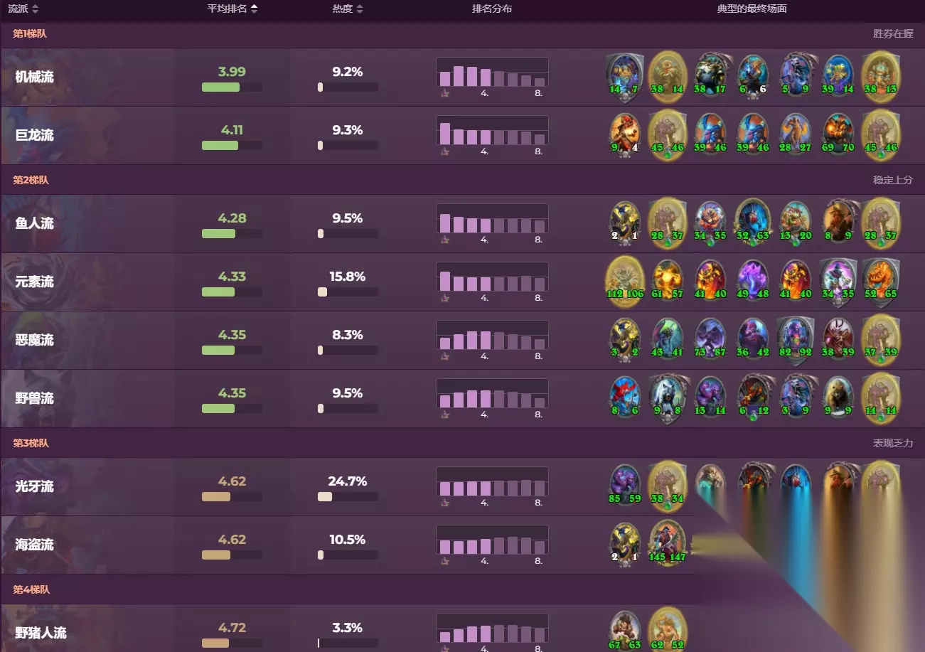 酒馆战棋的流派情况目前依然没有太大的变化,机械流目前已经完全碾压其他流派了,巨龙在泰蕾苟萨被削后就很难和机械抗衡了。而没有光牙的光牙流,目前是酒馆战棋里最热门的流派,其实很好理解,现在这个版本偏向于苟烂分,很多英雄都会选各个种族最好的胚子来养,所以光牙流很容易成为大家的选择。野猪人已经完全沦为了辅助,纯野猪人流派已经彻底垫底了。 根据前游戏总监Ben Lee的爆料,酒馆战棋很快就要推出新种族了,按照惯例大概率是和新版本的第一次补丁一起推出,到时候酒馆战棋流派格局应该会迎来大的变化。
