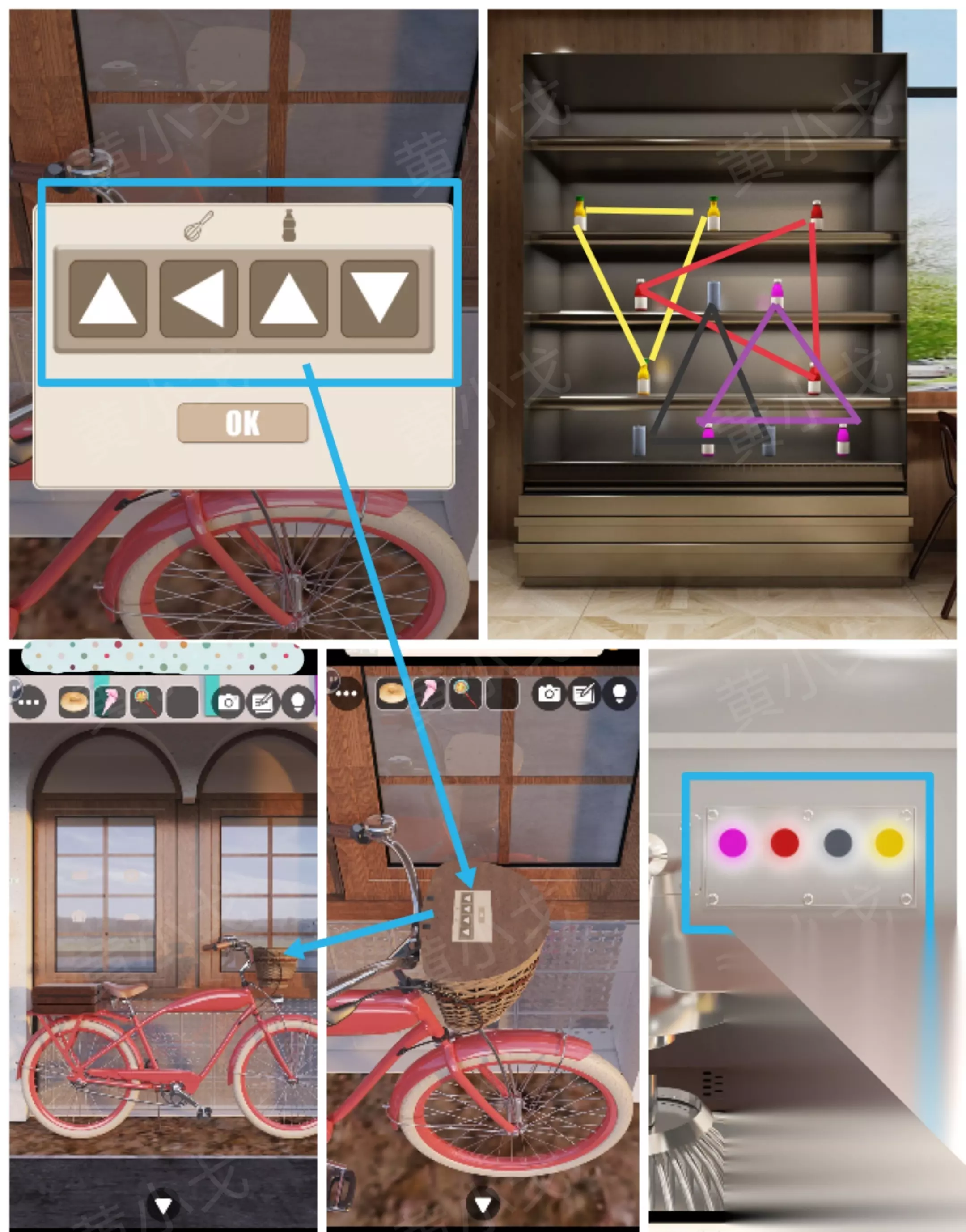 [街道-咖啡店门口] 13.点击自行车车篮上的密码锁,根据上面的图案提示,结合[咖啡店]场景牛奶摆好饮料之后得到的线索和[蛋糕店厨房]场景打蛋器亮灯的颜色线索,调整密码锁 车篮上的图案:打蛋器和饮料 [厨房]场景打蛋器亮灯颜色:粉红黑黄 [咖啡店]场景饮料品颜色及位置构成的三角形形状
