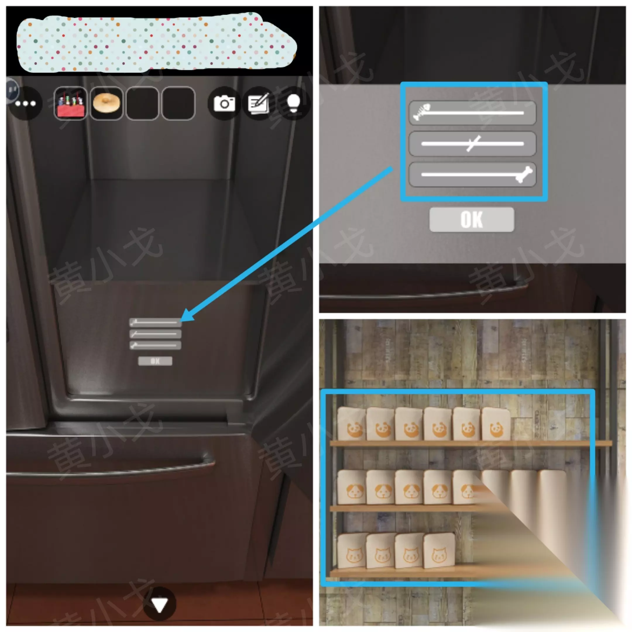 3.点击冰箱里的密码箱,根据上面的图案提示,结合[木门]场景架子上的吐司图案及数量线索,调整密码锁 熊猫图案吐司-6、小狗图案吐司-8、猫图案吐司-4 解谜思路:①确定位置:猫吃鱼、熊猫吃竹子、狗吃骨头 ②数量最少是左边,数量最多在右边,不多不少在中间