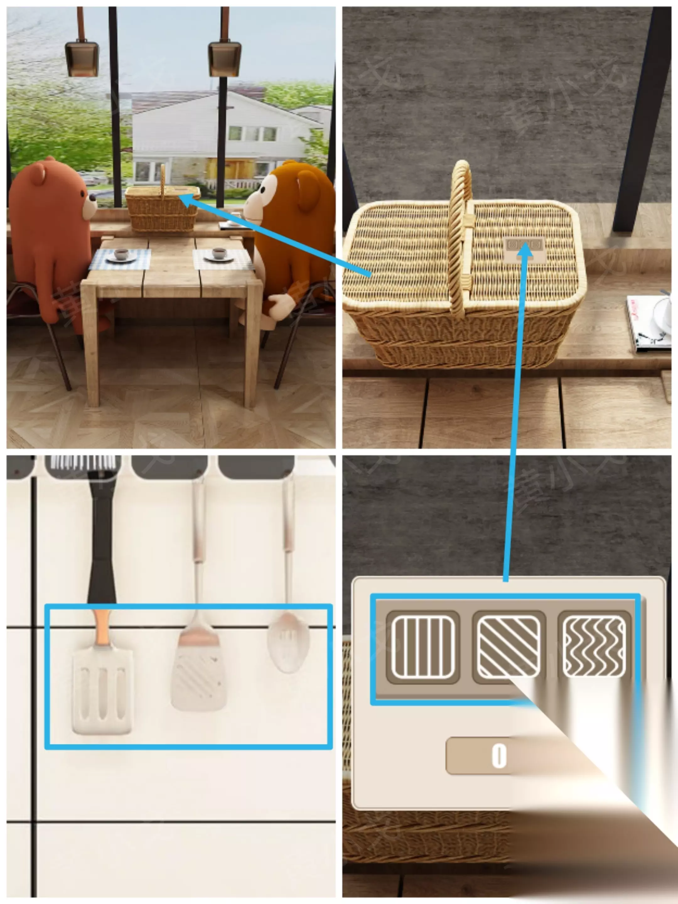 9.点击窗台上的篮子,根据[蛋糕店厨房]场景铲子的形状,调整密码锁 竖、斜、波浪