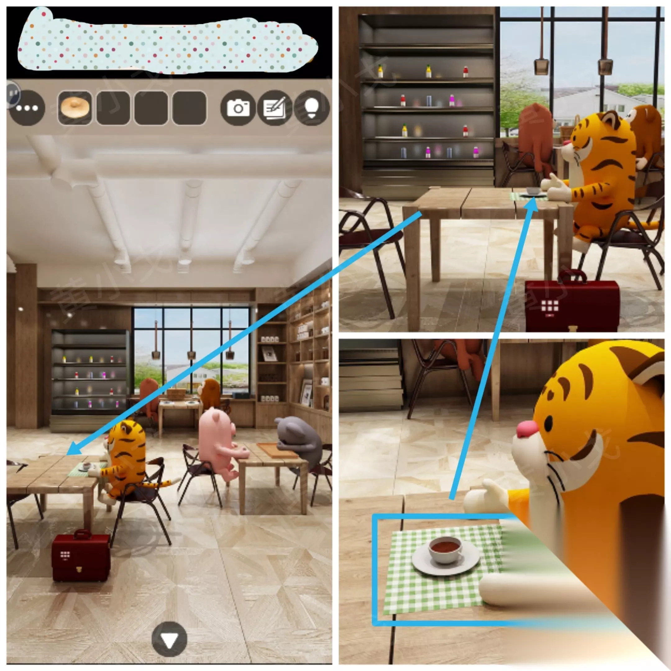 [街道-蛋糕店门口] 11.点击椅子上的盒子,根据上面的颜色提示,结合[咖啡店]里客人的杯垫颜色线索,调整密码锁 熊、老虎、猴子 盒子上的提示:蓝绿白 咖啡店客人及杯垫颜色:老虎-绿、熊-蓝、猴子-白