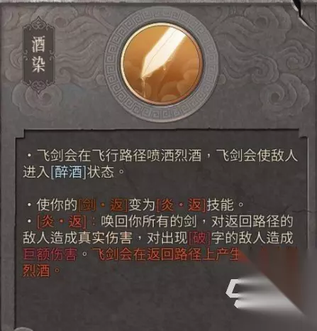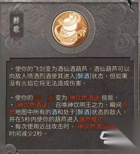 先介绍火流派的学名,即为神饮明王流,这个流派的核心被动可以说简单粗暴,所有攻击先加个百分之十,然后一定概率根据近战面板伤害的百分比造成额外的火焰伤害,所以思路也很明确了,就是一方面面板要高,一方面就是利用火焰伤害带来的新机制来增强伤害。 下属两个流派分别是酒染和醉歌。前者会让飞剑变成一个播撒烈酒的飞行道具,让命中的敌人染上醉酒的debuff,这个状态可以触发额外的伤害,并且收回飞剑会产生火花,从而点燃烈酒之径,对场地中的敌人造成火焰伤害。醉歌则是用背后的酒葫芦主动喷烈酒,让敌人染上酒,然后剑返可以点燃全图的酒和醉酒敌人,并且让酒葫芦进入爆发模式,所以二者的操作手法是飞剑,移动,剑返来穿插攻击,后者醉歌的对剑返的使用率更高,因为可以靠平A来减cd。