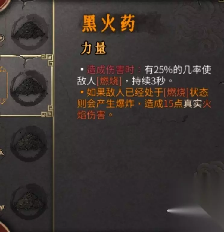 圣物选择方面,核心位置鬼妃断发和踏风草都可以,前者会让醉酒状态的敌人受到额外的易伤,怒气爆发时会额外造成真伤。力量位置可选黑火药,毒囊,敏捷位置一般选雄黄,雄黄的效果可以让火焰伤害额外附加毒状态,而橙色雄黄也会让这些debuff额外获得易伤。然后火硝石的话属于四个位置都能带,功效位最好有橙色品质的再选。如果选的比较合适,这个火毒流确实可以实现双手插兜的效果,敌人又是燃烧,又是中毒的,都不用你砍,自己就扣血扣死了。