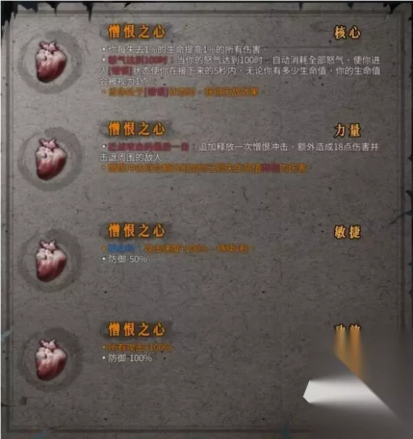 力量位一般只推荐黄纸,近战附加额外的火焰伤害效果,搭配收剑在此基础上再提升的火焰伤害,符合酒染流的操作习惯。敏捷位选择较多,朱雀,白虎之魂,堕龙都是可以的,功效则选择凝气草或者憎恶之心,增加怒气覆盖和伤害增益。