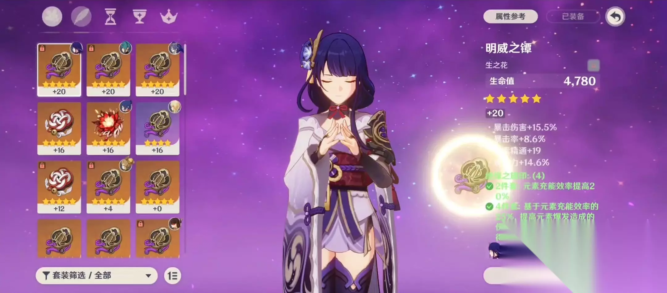 圣遗物和武器的选择要互相配合,比如带充能武器时,圣遗物可以适当补一些攻击词条;带输出武器时,则要优先保证充能效率达标。雷电将军的圣遗物培养周期较长,尤其是绝缘本出货率看脸,建议耐心刷取。她的强度非常依赖圣遗物质量,但成型后无论是输出还是辅助能力都很出色。对于资源有限的玩家,可以优先保证主词条正确,再慢慢优化副词条。充能效率是她的生命线,无论如何都不要牺牲这一属性。