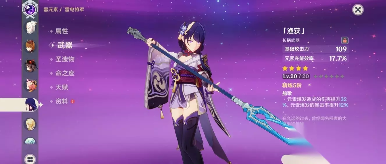 主词条方面,时之沙无脑选充能效率,这是她的核心属性。空之杯的选择要看队伍配置,如果队伍里有班尼特或九条裟罗这类攻击拐,雷伤杯收益更高;反之则攻击杯更稳定。理之冠优先暴击率,如果暴击率已经达标(比如超过50%),再考虑暴伤头。副词条尽量往双暴和充能方向靠,元素精通和攻击百分比属于次优选项。武器搭配方面,专武薙草之稻光是最优解,能进一步放大充能收益。四星武器推荐渔获,它可以通过钓鱼活动免费获取,属性也非常契合雷电将军的需求。如果没有渔获,西风长枪或试作星镰也能用,但效果会打折扣。