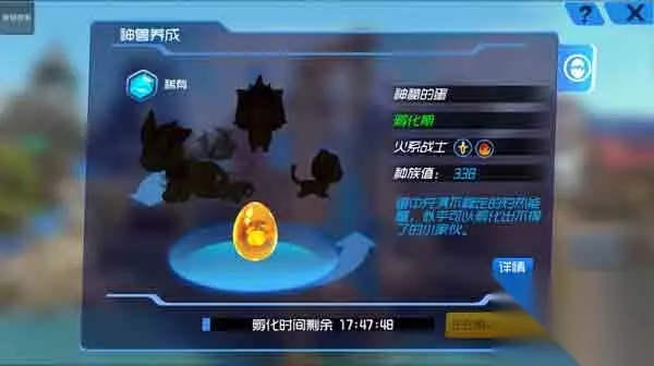 系统简介: 通过完成神兽孵化任务,玩家最终能够孵化出传说中的神兽燃烬猫仔。燃烬猫仔的第一阶段需要孵化神秘的蛋,当玩家达成孵化时间,便可以孵化出幼年期的燃烬猫仔——燃烬幼崽。之后燃烬幼崽的每一次进阶都能够提升种族值,使得宠物愈加强大;而每一次进阶也都需要需要玩家收集足够的材料——火焰结晶并消耗一定钻石,直至燃烬幼崽进阶为完全体——燃烬猫仔。