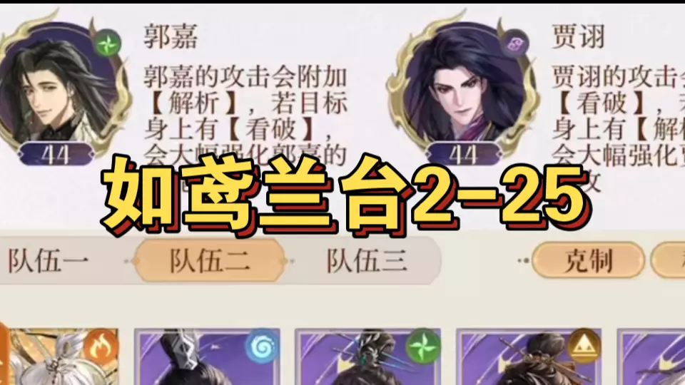 这是手游《如鸢》的兰台1-25关卡跟打教程,适配全员40级的队伍,面对郭嘉、贾诩关卡,教程给出优先击败贾诩的战斗策略,帮助玩家通关该关卡。