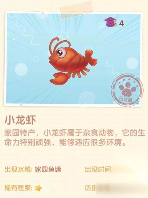t15_2-t15_1:8.0 标签: 小龙虾 摩尔庄园手游小龙虾怎么获得?小龙虾获取方法是什么?下面来看看233乐园小编带来的摩尔庄园手游小龙虾获取方法攻略。 小龙虾(家园特产) 钓鱼点:家园鱼塘 刷新时间:全天 稀有程度:一颗星