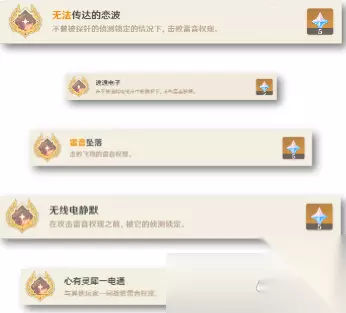 3、雷音坠落 难点需要控血、等待时间长且难以分辨是否飞天,推荐角色弓箭主c。 还记得第一个成就「无法传达的恋波」里的【锁定·落雷】技能吗,此成就需要在雷音权限释放落雷的升空期间击败它。这个技能释放间隔较长,大约1min30s一次。每次飞天大约持续8s。注意升空状态下只有弓箭手的瞄准射击才能打到,当然流浪者不管。在这之前还需要控血,尽可能压低血线,要保证能够在短时间内击败。 4、无线电静默 该成就完成非常简单,只需要让角色在雷音权限扔出【探针】后靠近被它标记,等待雷音权限释放【怒吼】技能即可完成成就。注意不要攻击雷音权限,一点伤害也不能打出来。 5、心有灵犀一电通 和其他玩家一同击败即可获得该成就——前提是有人愿意和你一起。 好啦,上述内容既是这篇,原神雷音权现五个战斗成就完成攻略,隐藏成就完成之后奖励5个原石,最终可以拿到30原石了,大家不要小看蚊子腿肉,积累才能变富有。