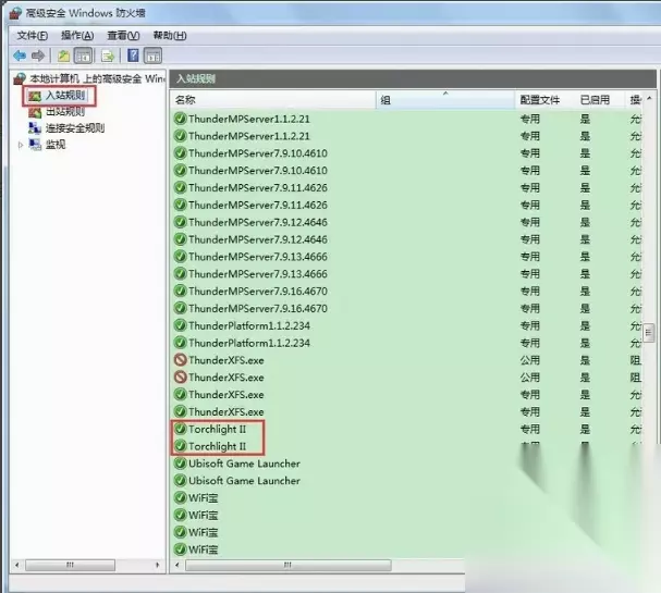 3、左上角,你会看见入站规则,点击入站规则,在中间窗口里面找到如图所示的两个程序,这个就是火炬之光的程序,点击右键进入属性,更改设置为允许连接。两个都有改过来,这样,大多数都已经可以联机了。如果还不行,看下面。