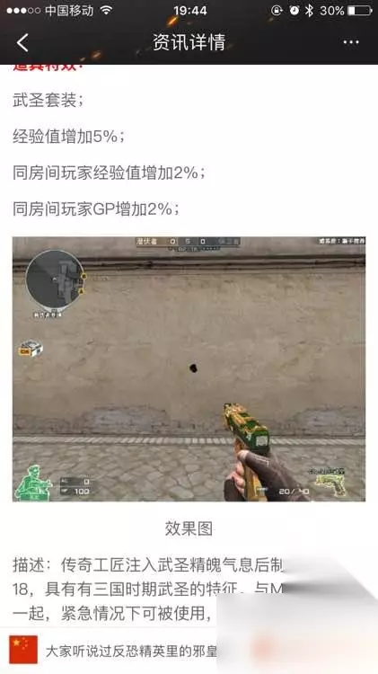 新手枪 道具特效: 武圣套装; 经验值增加5%; 同房间玩家经验值增加2%; 同房间玩家GP增加2%; 对于这两个绑在一起的新英雄武器,在小编这里我认为,如果你是土豪那么这把枪是可以买来看的,像平民玩家我是建议不买的,想想现在的活动,再想想黑龙、雷神这些武器。感觉用不了多久又会成片出现。现在的主流武器就是M4雷神、黑龙。而且他的特效是有千变代替的。他的扔代价的确是很新意,但是没有什么用,在实战中几乎作用为0。所以我不建议大家去买这个武器。还是等下次看看还能出什么吧!
