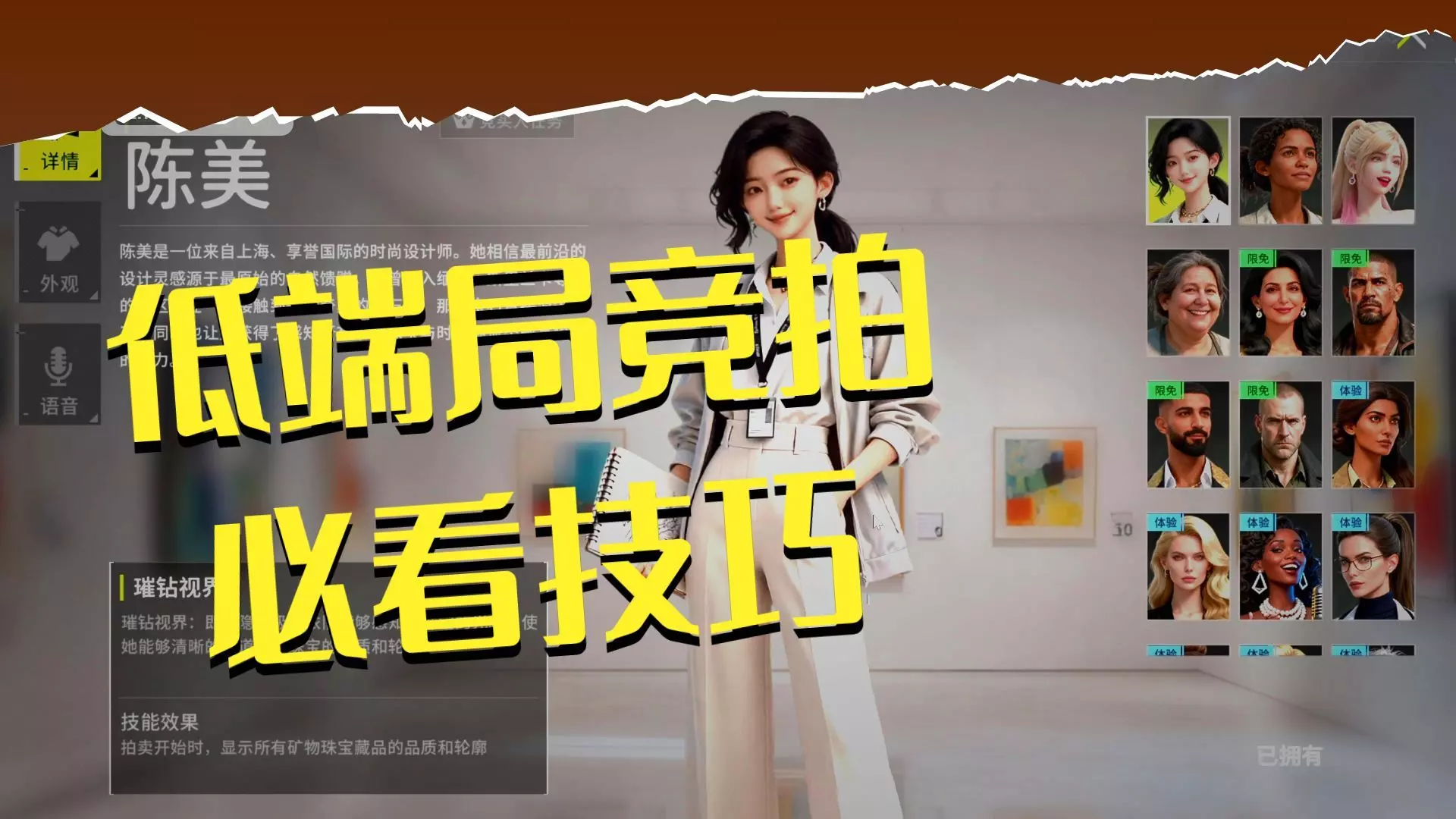 这是《竞拍之王》的技能篇教学内容,介绍了陈美、伊万等游戏角色的技能,比如陈美的“璀钻视界”可显示珠宝矿藏类藏品的品质和轮廓,巧用这些角色技能能将信息差转化为竞拍优势,实际效果以游戏上线为准。