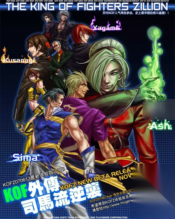 在当时的M.U.G.E.N大潮里,国人作者Misamu.K.Young氏(以下称作Misamu)逐渐感到M.U.G.E.N的纯开放式制作很难实现原作效果,同时又因为不太喜欢M.U.G.E.N原系统里的2v2混乱无序的战斗模式,想要专门做一个自有规则的游戏。苦于当时没有美术人员,他借用了司徒剑桥漫画《拳皇Zillion》的一些素材。这可能是立项最早、制作最完善的KOF民间展开企划,方可、Mr.s等现在只能瞻仰的超元老级作者也都参与了这个项目。 带着这种目的开始的《Zillion》每一步制作都在向原作致敬,他们的作品对M.U.G.E.N业界的启发性也不容忽视。比如,他们把原本混乱的双人模式改为TAG模式、角色多服装体系、指令缓存系统等现在常见的M.U.G.E.N设定均为Z组开创,甚至在官方《KOF2002》之前做出了MAX2超必杀技的设定。《Zillion》在角色选取方面并没有死板地拘泥于正作KOF的参加者,它的选择只有“拳脚为主的角色”和“近现代角色”2个大原则。现在流通的最新版本里,就有Z组原创的2D版《Maximum Impact》主角Alba、《饿狼传说Real Boat 2》的Alfred、巴西作者Fervicante氏的Lucy等角色。 2008年,第一个国人完全原创角色“司马礼”发布,2010年公开了完成度比较高的“KOFZ MK3”版本,原画为Z组美术总监Kaisami,2011年又公布了和他组队的另2名原创角色曹龙、陆美,看起来一切都走在正轨上。