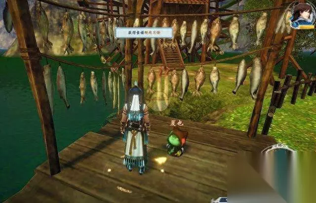 然后分别去房屋区到种植区半路的凉亭及水边晒鱼干的架子那里找小龙人获得(这两个小龙人都是隐身的,需要靠近之后才会出现)