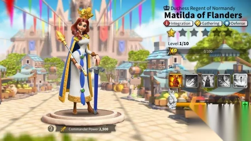 该武将碎片可以通过外服二周年活动获得,也可以通过黄金、白银宝箱获得。 主动技能 - 佛兰斯德少女(1000怒气):对目标部队造成技能750系数伤害,并降低其15%攻击力,持续2秒。 被动技能 - 玲珑之心:采集石头+25%速度,食物与木材+ 20%速度。 被动技能 - 莫拉:所率领之攻城单位生命值+30%、防御力+30%。 被动技能 - 治国女王:所率领之部队容量+15%,但攻击力下降20%。 觉性技能 - 佛兰德斯的馈赠:完成采集时,额外获得10%资源。 技能优先升级被动玲珑之心和治国女王,然后是被动莫拉,再是主动弗兰斯德少女,觉醒技能是挺不错,不过一般不会优先给她觉醒。